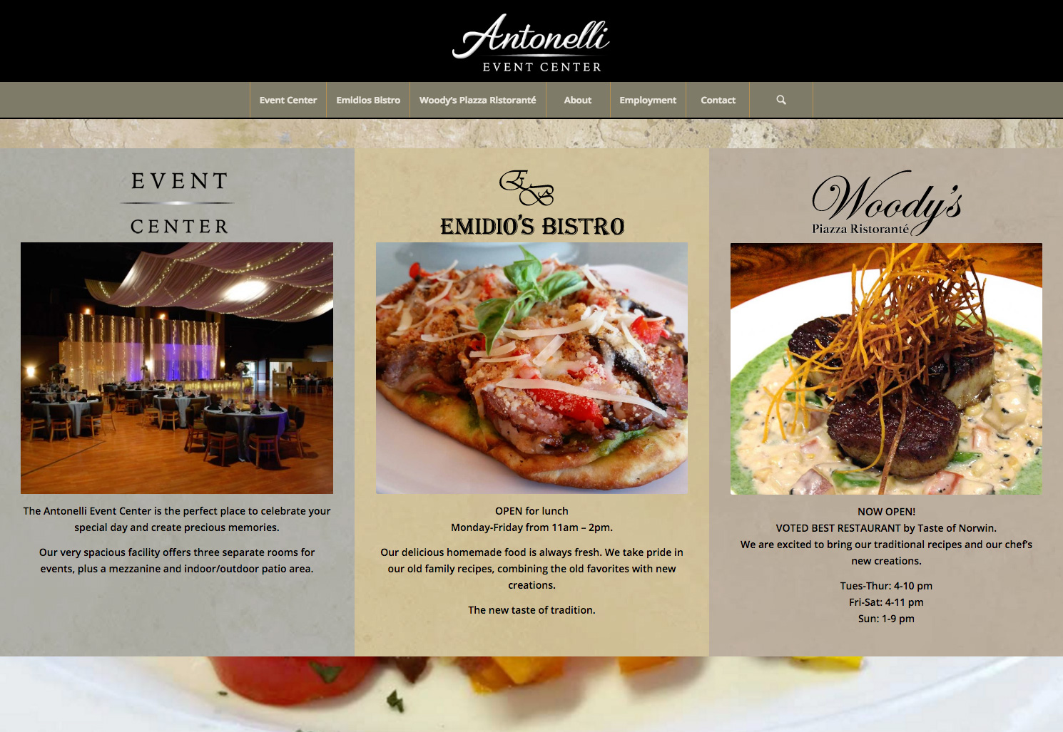 The Antonelli Event Center recently opened in Irwin, PA and Hot Designs was called in for the entire package. I was even involved in naming the facility. I designed logos for three separate places in the facility, the center itself, Emidio’s Bistro and Woody’s Piazza Ristorante. All of the photography on the new website is by me personally, also. This place has really hit the ground running.